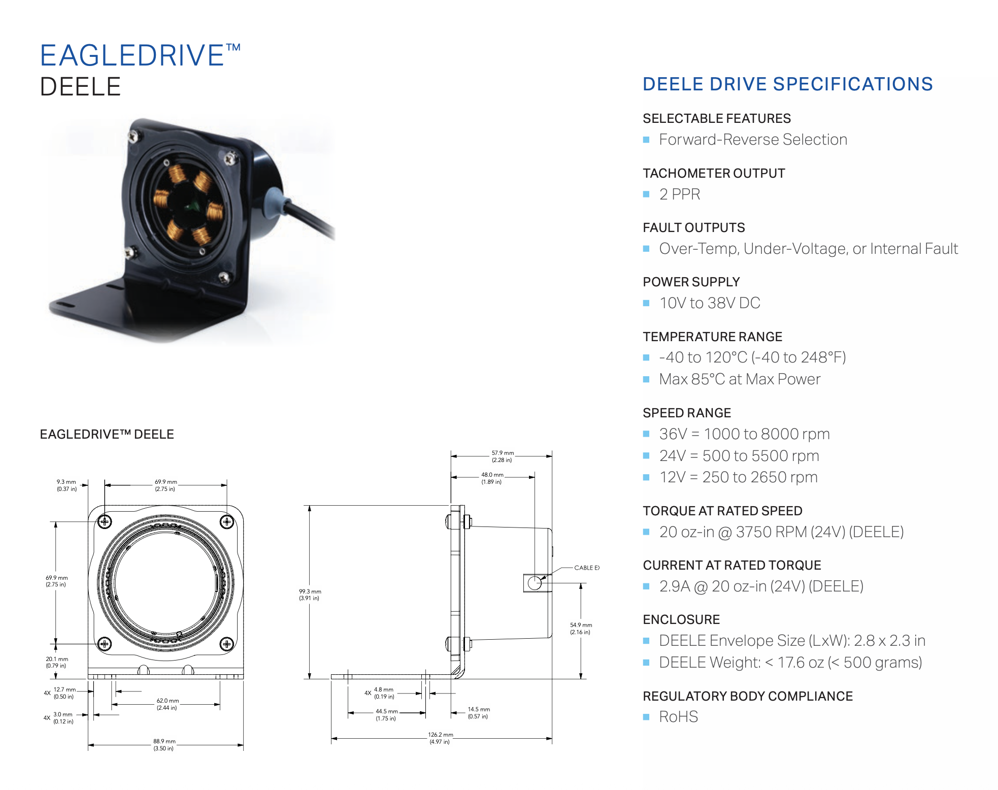 | P100000002332 | Drive | DEELE, FIXED SPEED | DC EagleDrive™ ELE, Electromagnetic Brushless (Rev1.5); 5000RPM FIXED SPEED, Power: 10-38VDC, 2-wire leads, 20 oz.-in, 72W, LE-Mount |